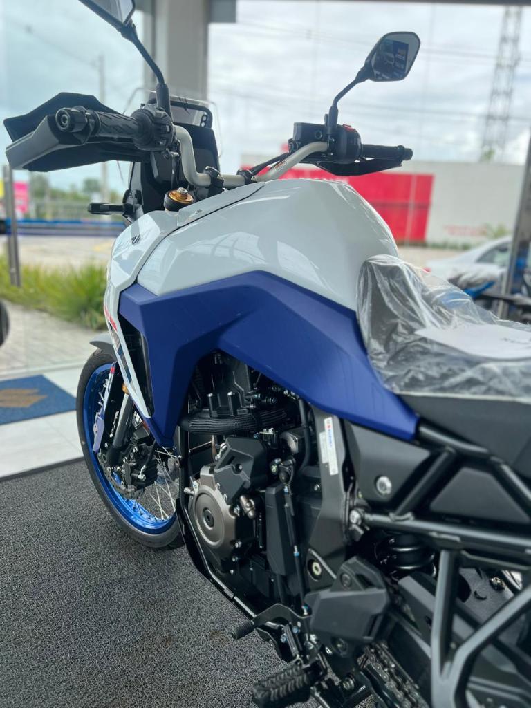 A Suzuki V-STROM 800DE vem equipada com motor bicilíndrico de 776 cc, suspensão de longo curso, roda dianteira de 21”, freios ABS com modo off-road, controle de tração com modo Gravel e quick shifter bidirecional.