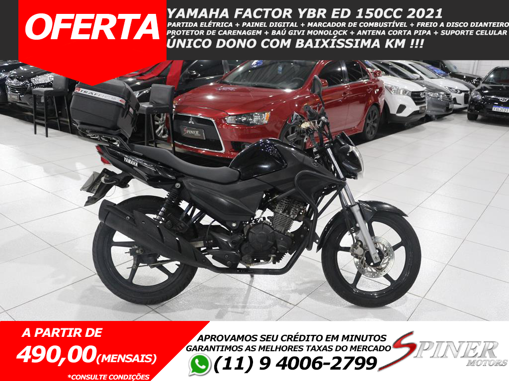 Versão Factor YBR ED 150cc equipada com Partida Elétrica + Painel Digital + Marcador de Combustível + Freio a Disco Dianteiro + Protetor de Carenagem + Baú Givi Monolock + Antena Corta Pipa + Suporte Celular.