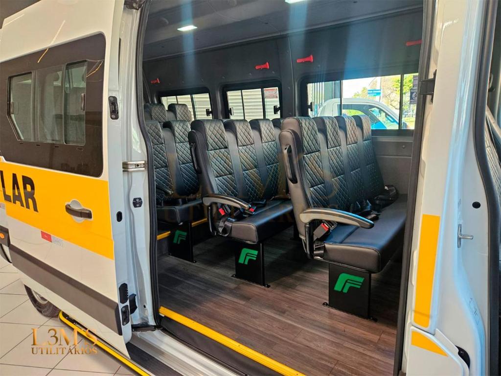 Veiculo zero quilometro configurado para o transporte escolar com teto alto e chassi extra longo proporcionando o maximo de espaco e seguranca para os passageiros.