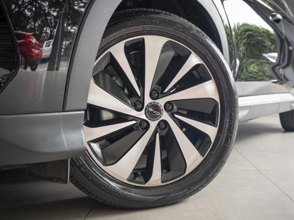 Exterior preto Delan, interior bi-color em couro azul e cinza claro, tração integral sob demanda, acabamentos externos em chromo, teto solar elétrico e panorâmico, rack de teto, câmera tridimensional, rodas diamantadas aro dezenove, repetidor de seta nos retrovisores, bancos dianteiros elétricos, conjunto óptico full LED, sistema de som Infinity com dez alto-falantes, abertura automática do porta-malas, assistente de permanência em faixa, controle de cruzeiro adaptativo, alerta de pontos cegos, limitador de velocidade, modos de condução, chave presencial, apoio de braço em couro, carregamento duplo por indução para smartphones, rebatimento eletrônico dos retrovisores, forração em couro no painel e portas, acabamentos em alumínio, carpetes em tecido, cintos de três pontos para os ocupantes, banco traseiro bipartido, ganchos internos organizatórios, luz de cortesia, saída de ar-condicionado para os passageiros, conexões USB e USB-C, soleiras BYD, multimídia central rotativa, painel de instrumentos digital, linhas-guias dianteiras e traseiras, freio de estacionamento eletrônico, encosto de cabeça para todos.