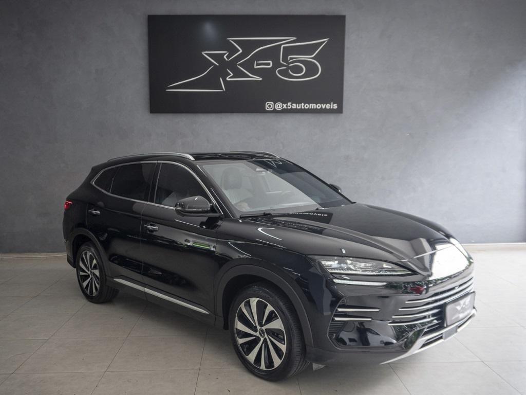 Exterior preto Delan, interior bi-color em couro azul e cinza claro, tração integral sob demanda, acabamentos externos em chromo, teto solar elétrico e panorâmico, rack de teto, câmera tridimensional, rodas diamantadas aro dezenove, repetidor de seta nos retrovisores, bancos dianteiros elétricos, conjunto óptico full LED, sistema de som Infinity com dez alto-falantes, abertura automática do porta-malas, assistente de permanência em faixa, controle de cruzeiro adaptativo, alerta de pontos cegos, limitador de velocidade, modos de condução, chave presencial, apoio de braço em couro, carregamento duplo por indução para smartphones, rebatimento eletrônico dos retrovisores, forração em couro no painel e portas, acabamentos em alumínio, carpetes em tecido, cintos de três pontos para os ocupantes, banco traseiro bipartido, ganchos internos organizatórios, luz de cortesia, saída de ar-condicionado para os passageiros, conexões USB e USB-C, soleiras BYD, multimídia central rotativa, painel de instrumentos digital, linhas-guias dianteiras e traseiras, freio de estacionamento eletrônico, encosto de cabeça para todos.