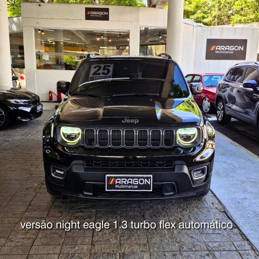 Jeep Renegade Longitude Night Eagle Turbo Flex com visual exclusivo black pack, motor T270 de até 185 cv e câmbio automático. SUV moderno, potente e ideal para a cidade. Conta com painel digital 7”, multimídia 8,4” com CarPlay/Android Auto sem fio, faróis full-LED e frenagem autônoma. Estilo, tecnologia e desempenho em um único carro. Aqui você dirige seu sonho. Condição válida sem troca.